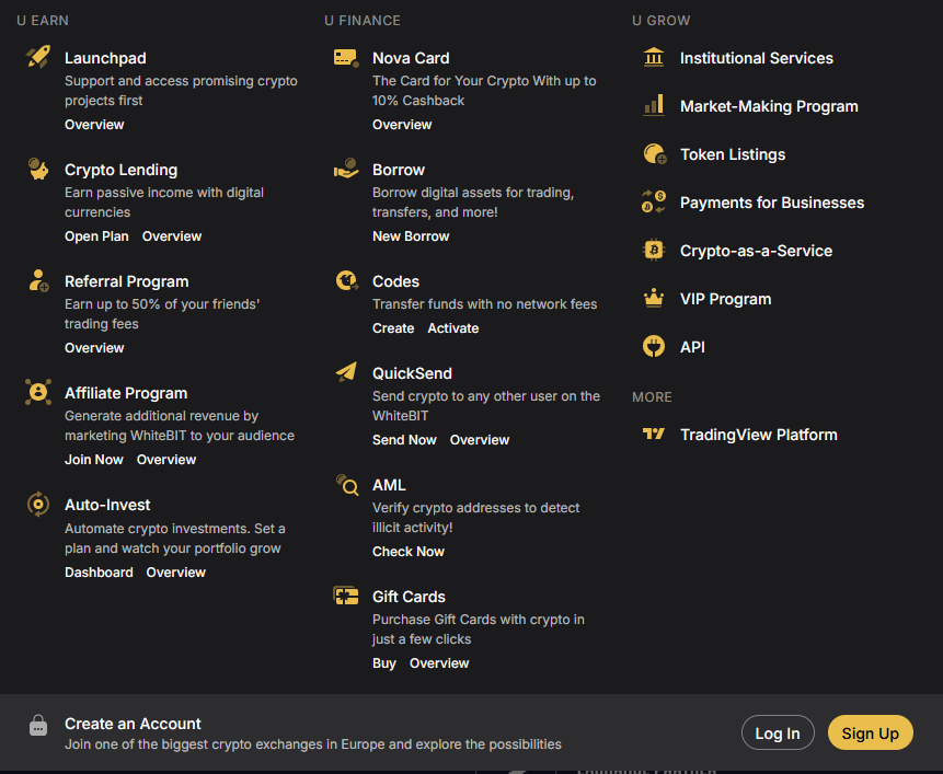 Một sàn giao dịch hiện đại không thể chỉ có Spot và Futures. WhiteBIT có một hệ sinh thái khá đầy đủ: